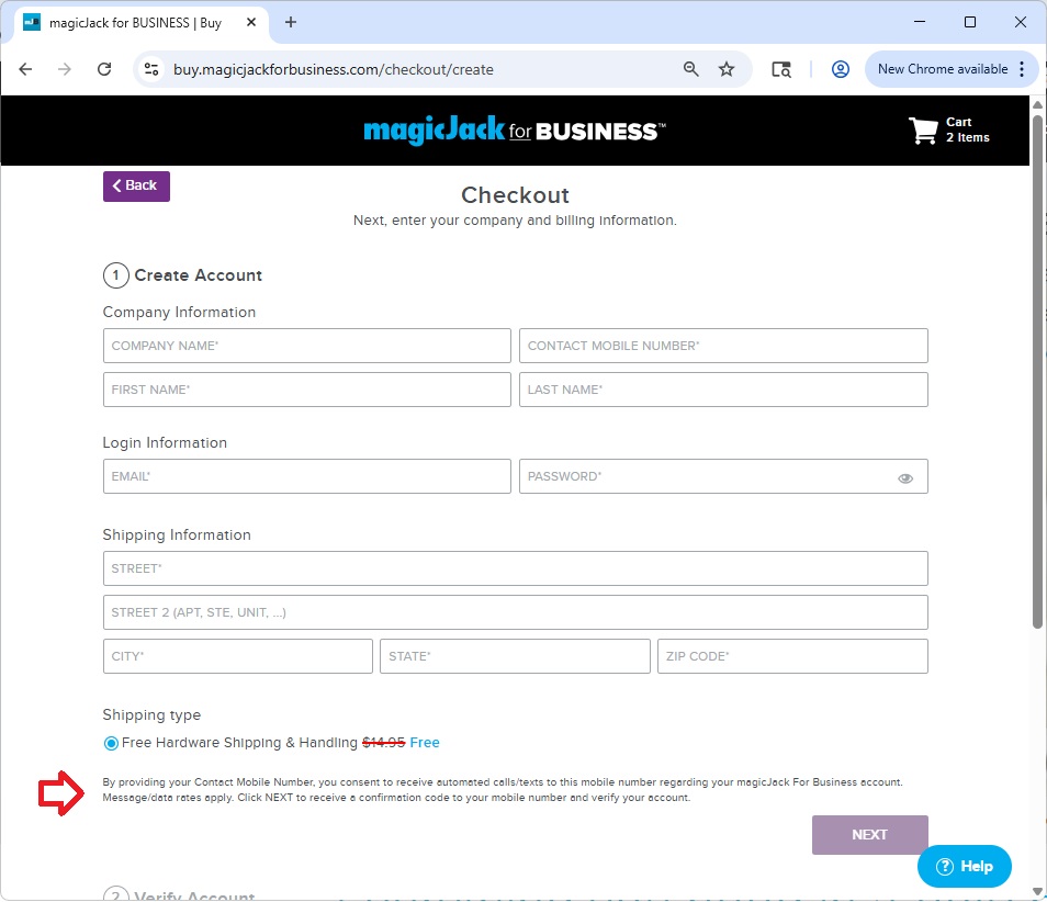 By providing your Contact Mobile Number, you consent to receive automated calls/texts to this mobile number regarding your magicJack For Business account. Message/data rates apply. Click NEXT to receive a confirmation code to your mobile number and verify your account.